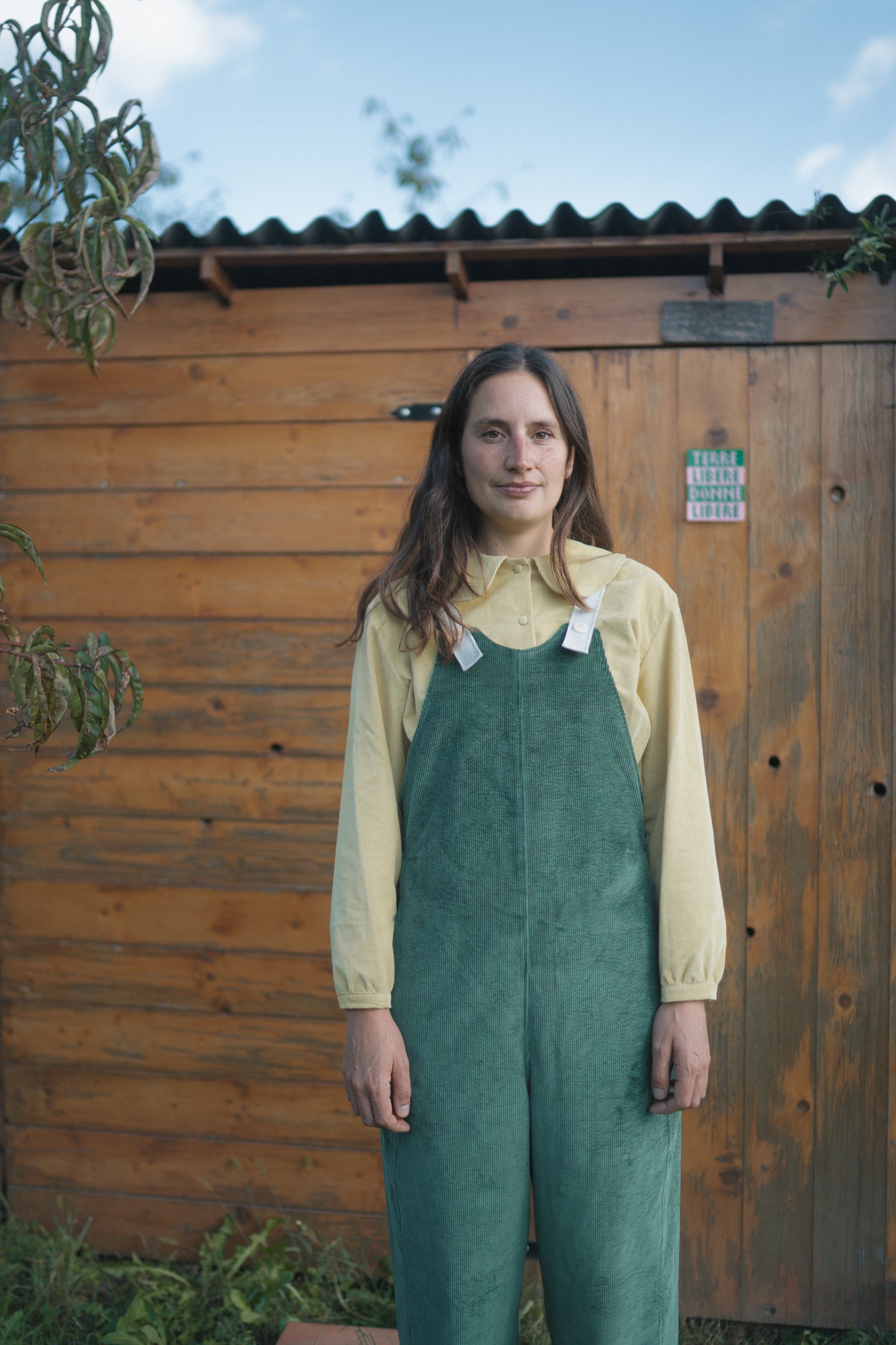Salopette in velluto a coste, con tasche sui fianchi a scomparsa. Bretella a contrasto color lattemacchiato regolabile a due lunghezze. Da abbinare ad una maglietta o una camicia.