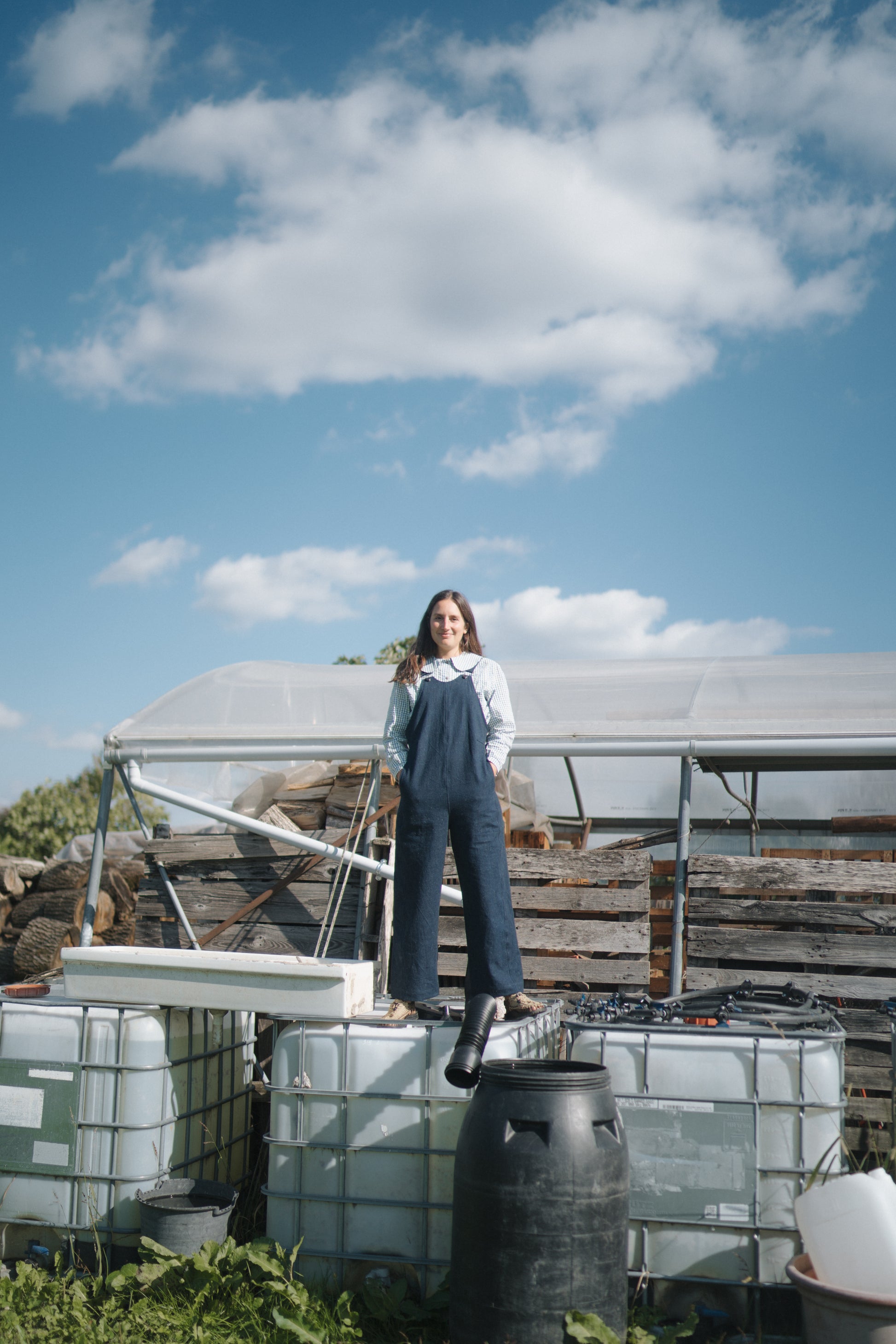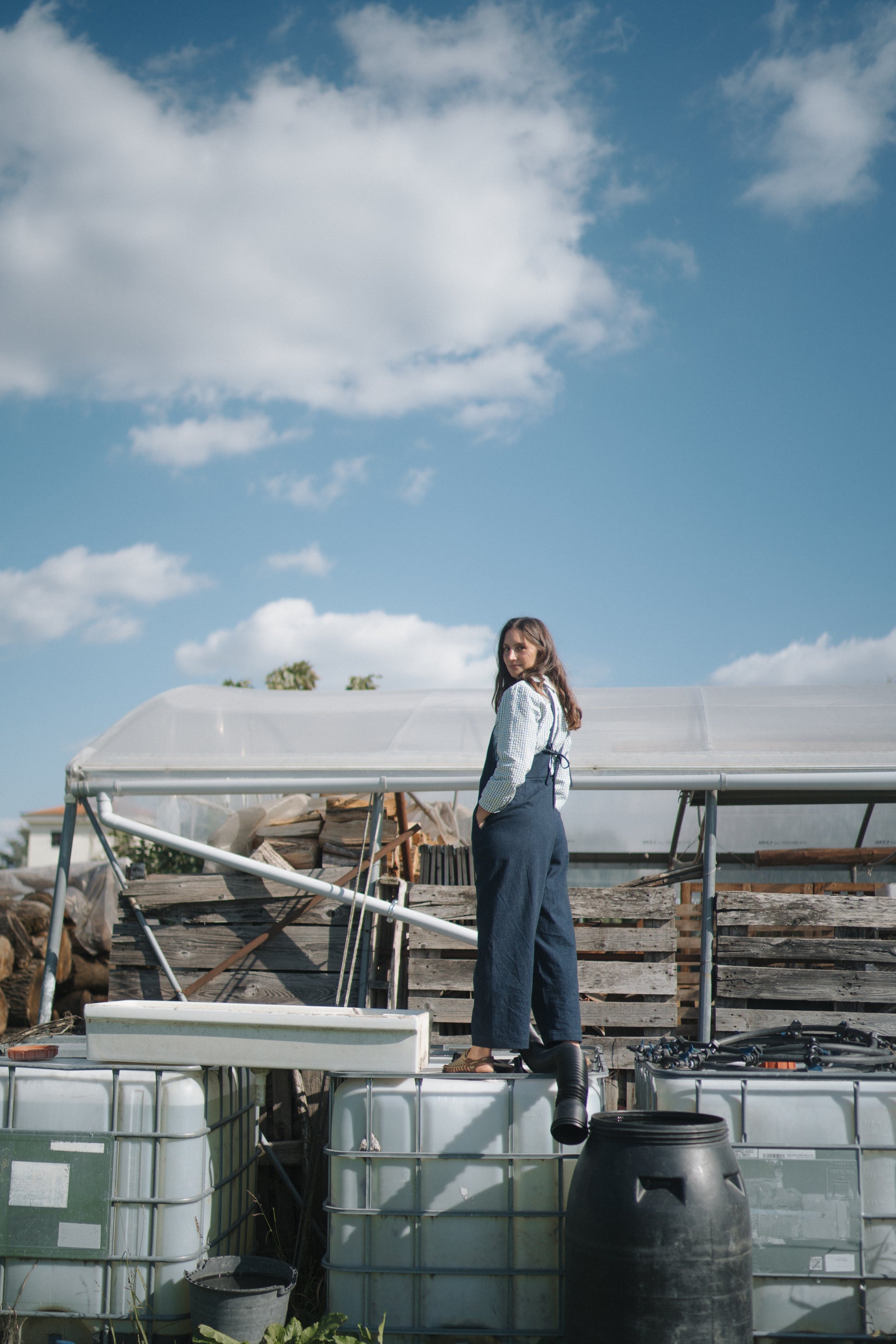 Salopette in denim giapponese con tasche sui fianchi a scomparsa. Bretella regolabile con ganci o bottoni. Fiocco sul retro. Da abbinare ad una maglietta o una camicia.